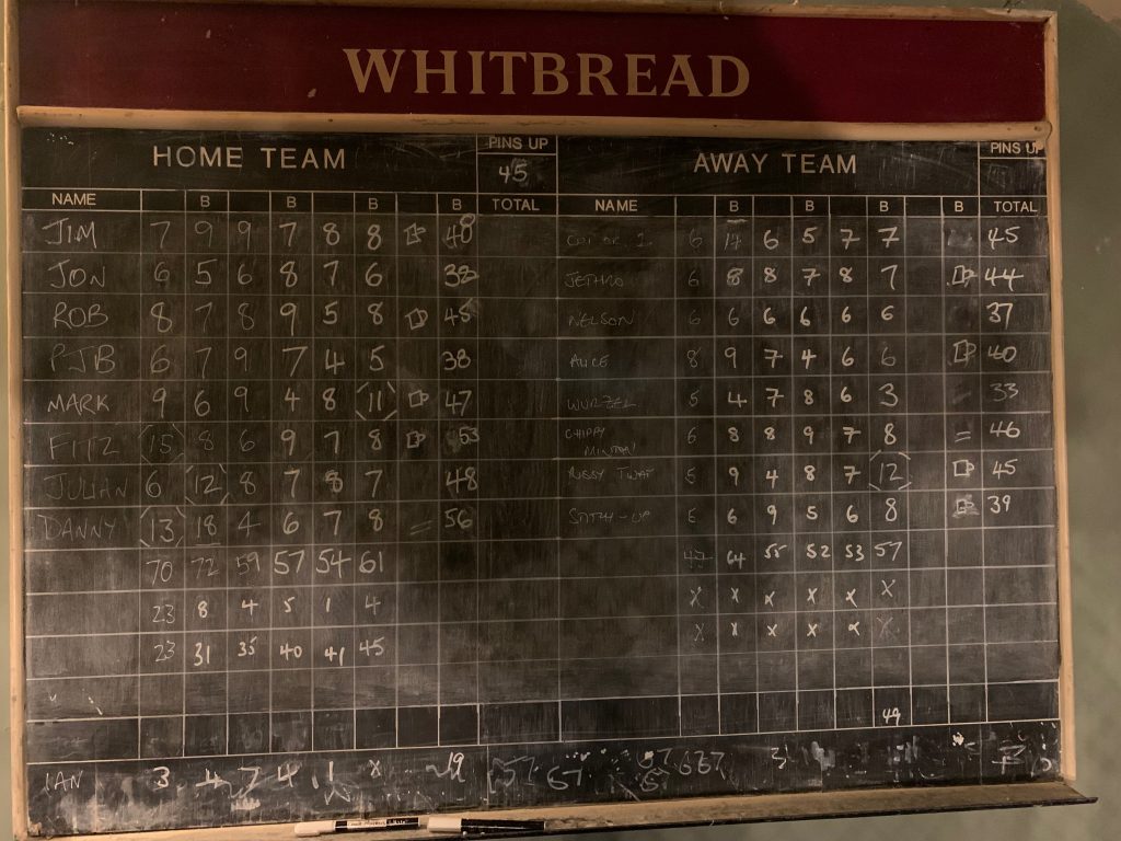 Jim Fussell 48 (won beer hand)Jon Pinnock 38 (crisp boy, lost beer hand)Rob Bishop 45 (won beer hand)Peter Booker 38 (lost beer hand)Mark Smith 47 (spare, won beer hand)Paul Fitzgerald 53 (spare, won beer hand)Julian Forbes 48 (spare, lost beer hand)Danny Ratcliffe 56 (spare, spare flopper, tote winner, lost beer hand)