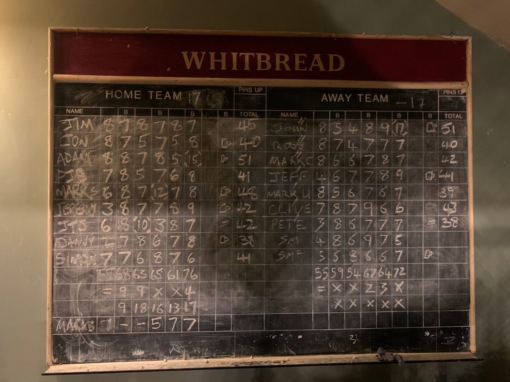 Jim Fussell 45 (lost beer hand)Jon Pinnock 40 (won beer hand)Adam Martin 51 (spare, tote winner, won beer hand)Peter Booker 41 (lost beer hand)Mark Smith 48 (spare, won beer hand)Jeremy Martin 42 (won beer hand)Johnny Torrens-Spence 42 (spare)Danny Ratcliffe 38 (crisp boy, won beer hand)Simon Bryars 41 (lost beer hand)Mark Bennett 26 (crisp boy, below the line)